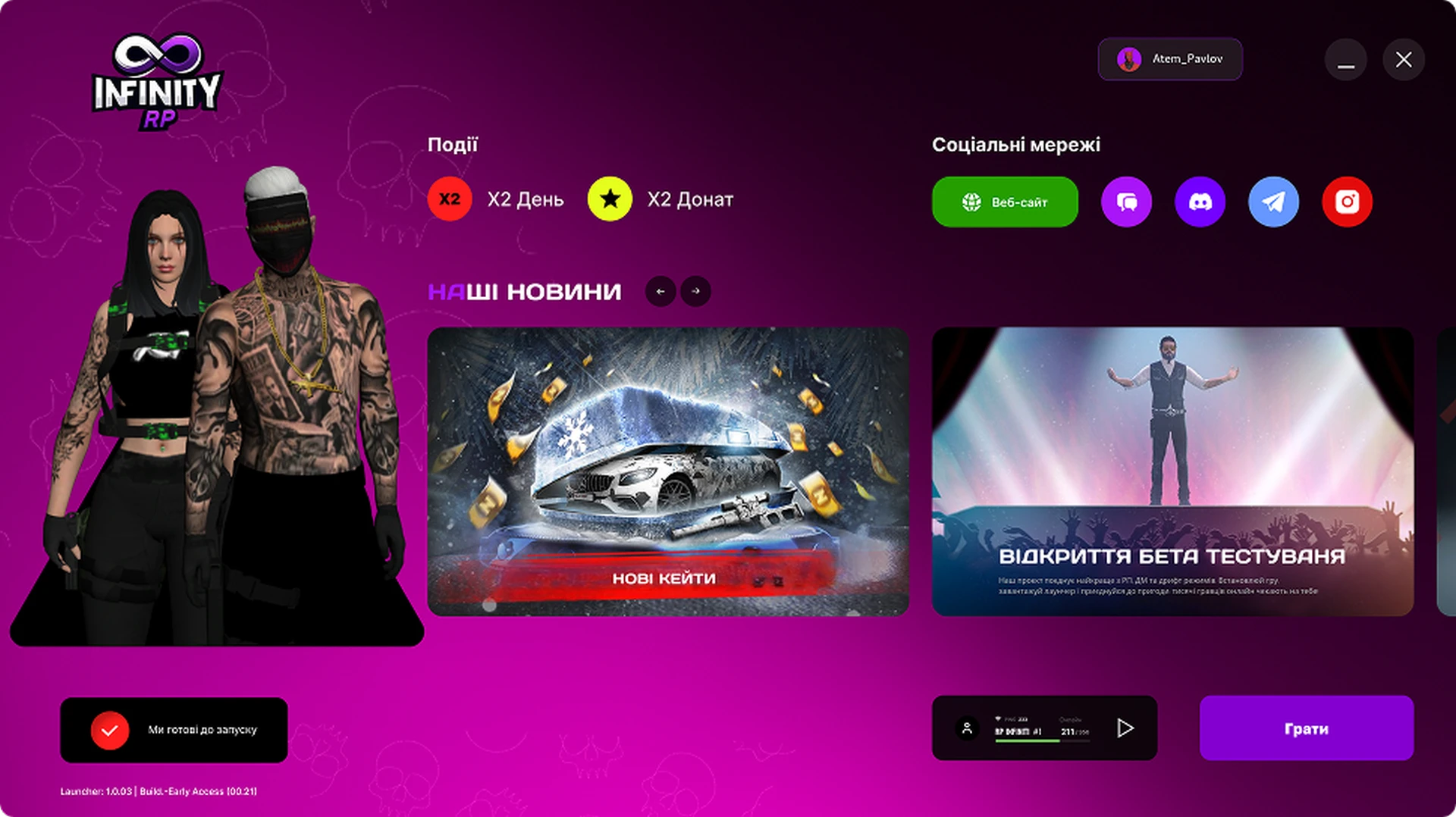 Infinity RP Ukraine – це проєкт, створений на основі популярного моду для MTA, що пропонує знайому карту у новому форматі. Ми доповнили світ гри унікальними моделями українських магазинів і бізнесів, розширили можливості для гравців завдяки унікальним видам робіт, покращеній оптимізації та оновленому дизайну інтерфейсів. Серед ключових особливостей: продумані системи взаємодії, розширений функціонал для неофіційних організацій, покращення віртуальних розваг, безліч нових скінів, автомобілів та інших унікальних доповнень. Пориньте у світ Infinity RP Ukraine GTA та відкрийте для себе новий рівень ігрового досвіду!